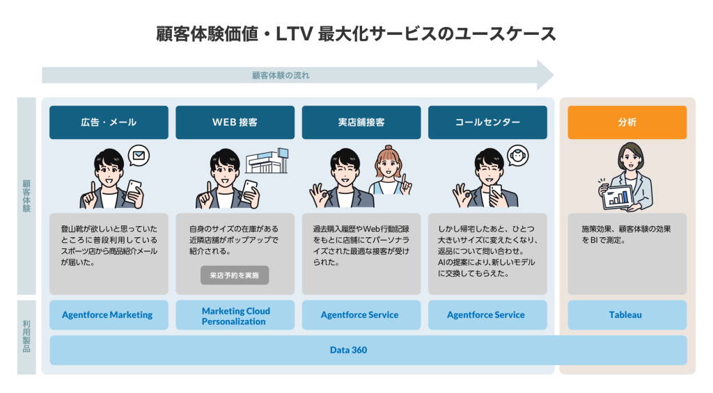 「顧客体験価値・LTV最大化サービス」は、Salesforceのマルチクラウド(Data Cloud、Marketing Cloud、Service Cloud)を活用し、顧客データの統合と顧客接点の最適化を実現するとともに、AIを活用した高度な顧客体験の提供を可能にします。