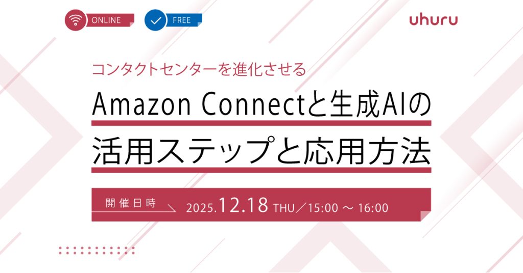 株式会社ウフルは、2025年12月18日(木) 、アマゾン ウェブ サービス ジャパン合同会社の協力を得て、コンタクトセンターにおける生成AI活用の最前線を紹介するオンラインセミナー「コンタクトセンターを進化させる Amazon Connectと生成AIの活用ステップと応用方法」を開催いたします。