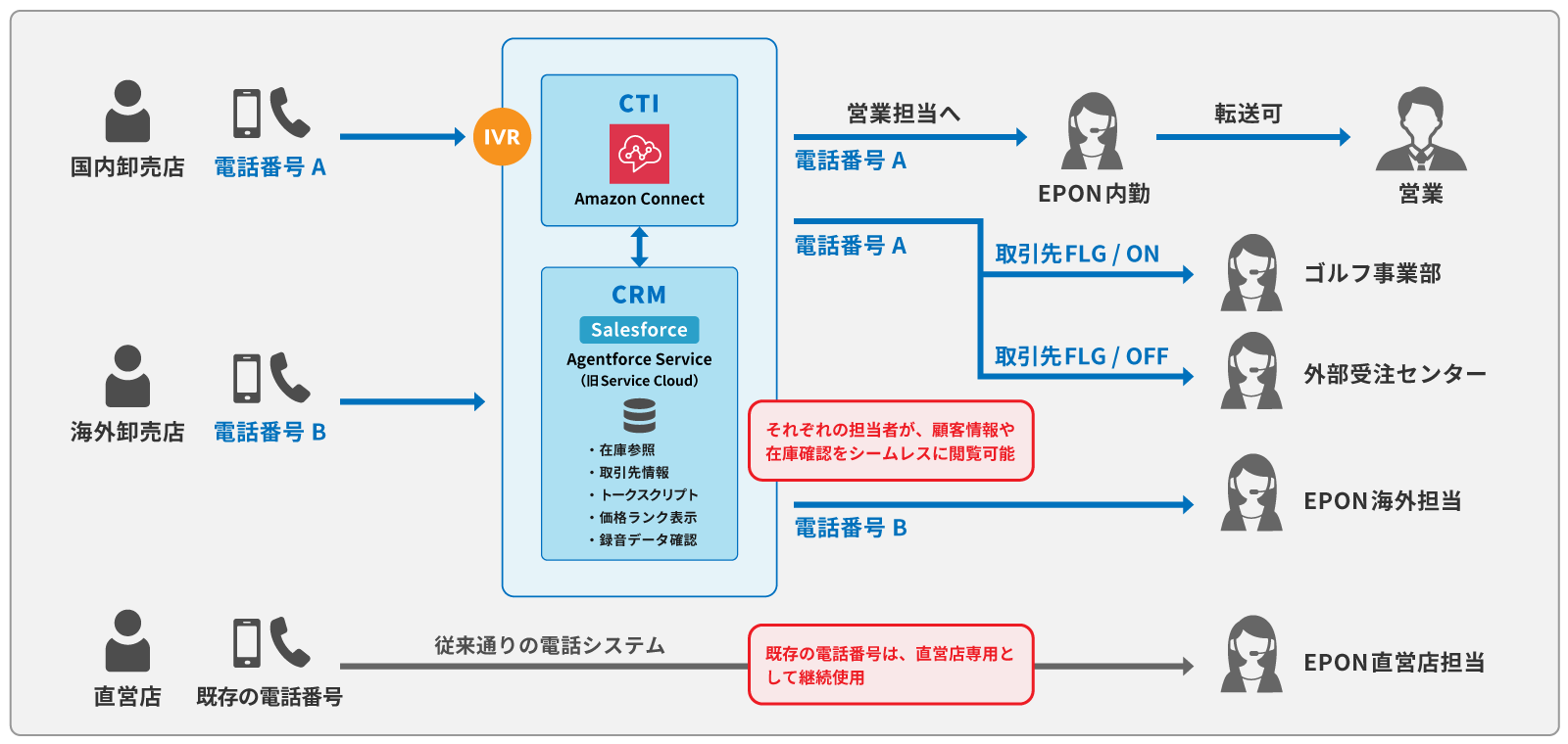 Amazon ConnectとSalesforceを連携活用した新たなシステムによって、「EPON GOLF」の受注業務は進化を遂げました。今回構築した3系統の受電フローのうち、直営店への電話は従来のシステムで直営店が、海外正規取扱店からの電話はAmazon Connectを通じて海外担当が直接受けます。一方、国内正規取扱店からの電話はAmazon Connectによるダイヤル分岐で、商品発注・在庫状況・配送状況の確認を希望の場合には外部の受注センターへ、その他の問い合わせを希望の場合にはエポンゴルフの営業担当者へ振り分けられます。