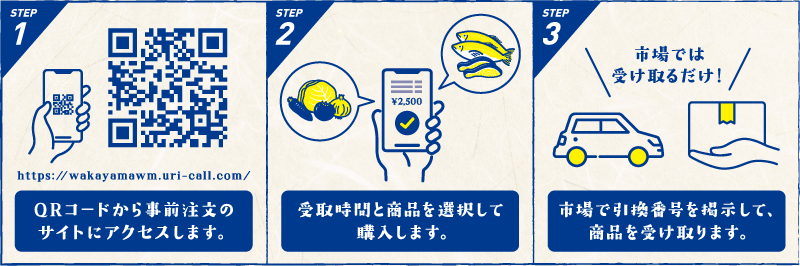スマートフォンでQRコードから事前注文サイト(https://wakayamawm.uri-call.com/)にアクセス。受取時間と商品を選択して購入後、指定の日時に市場で商品を受け取っていただきます。