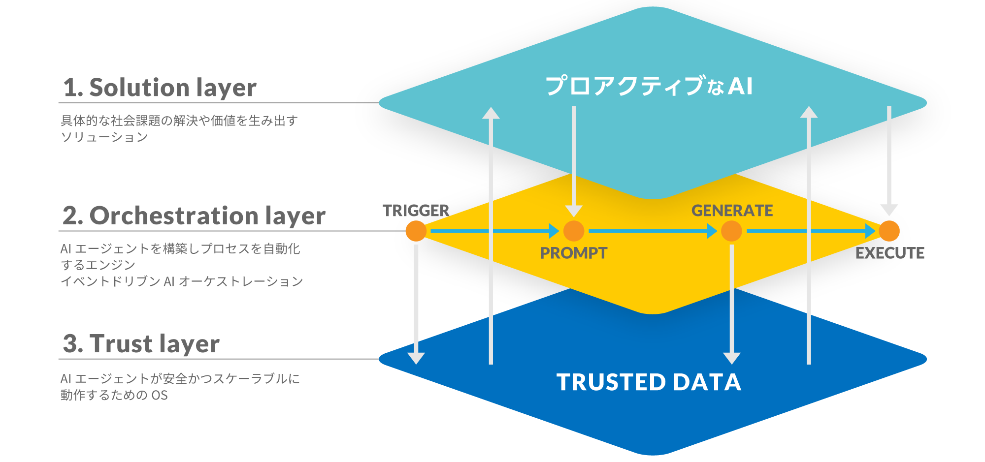 単なるツールとしてのAIではなく、企業が安全かつ継続的に価値を創出するための「Trust」「Orchestration」「Solution」の3つのレイヤーでAI活用を支援します。